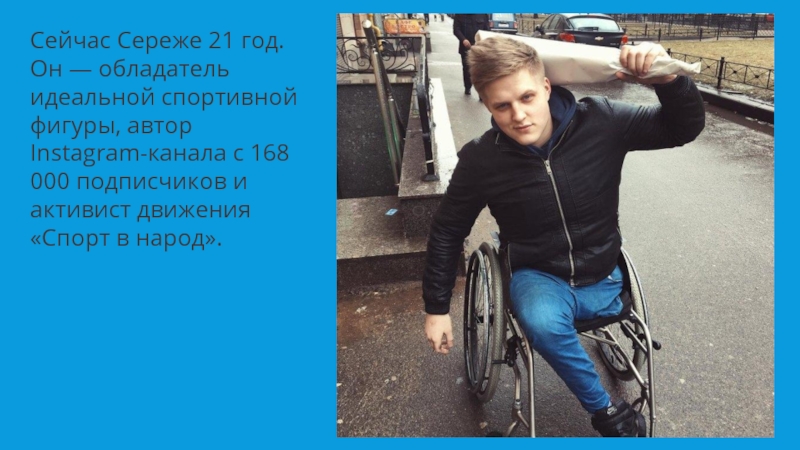Слайд 16Сейчас Сереже 21 год. Он — обладатель идеальной спортивной фигуры, автор
