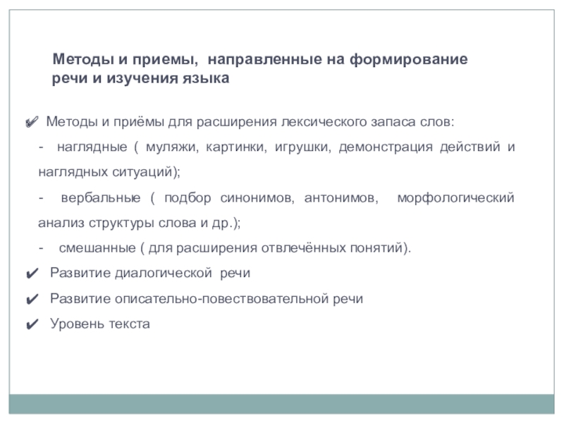 - наглядные ( муляжи, картинки, игрушки, демонстрация действий и наглядных ситуаций);
