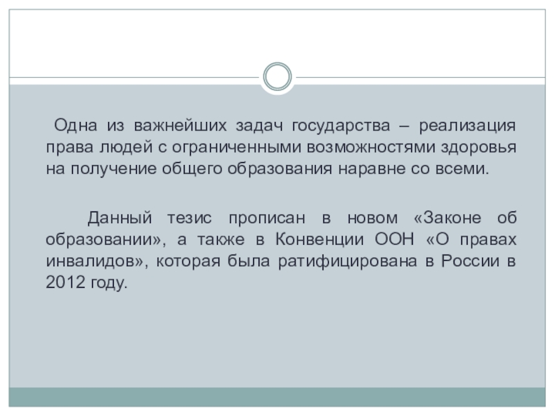 Данный тезис прописан в новом «Законе об образовании», а также в Конвенции ООН «О правах инвалидов», которая была ратифицирована в России в 2012 году.