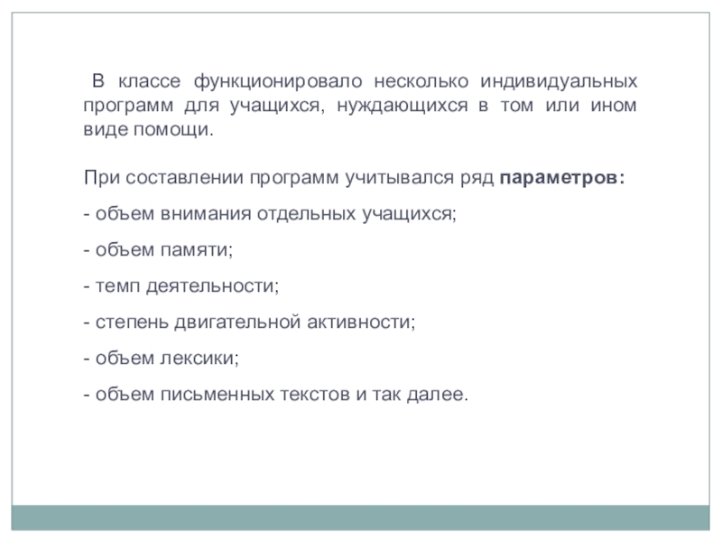 Слайд 10 В классе функционировало несколько индивидуальных программ для учащихся, нуждающихся в