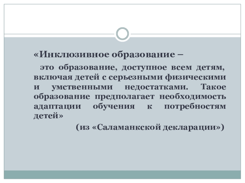 детям, включая детей с серьезными физическими и умственными недостатками. Такое образование предполагает необходимость адаптации обучения к потребностям детей»