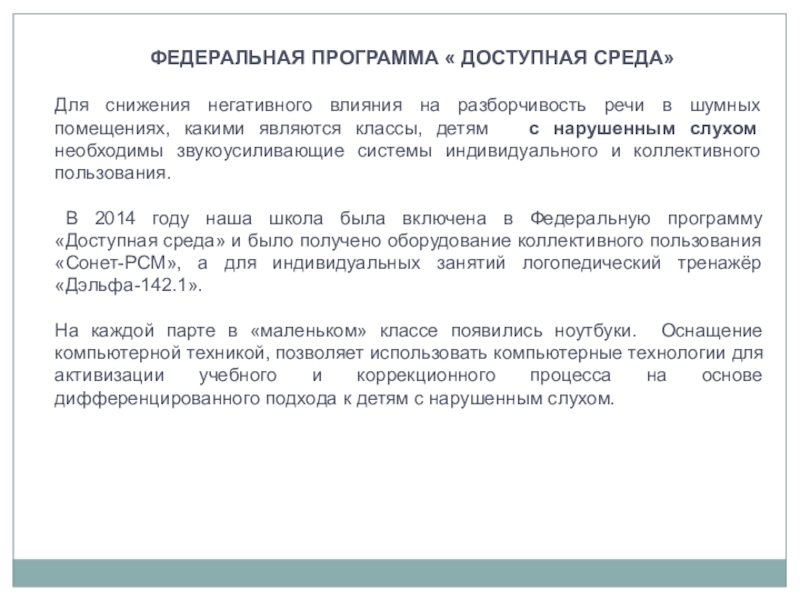 речи в шумных помещениях, какими являются классы, детям с нарушенным слухом необходимы звукоусиливающие системы индивидуального и коллективного пользования.