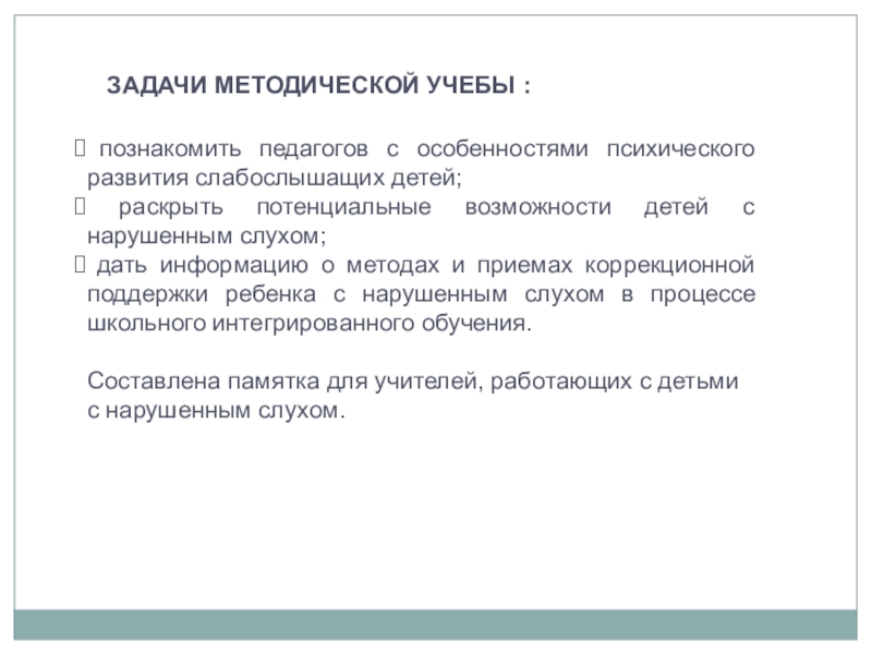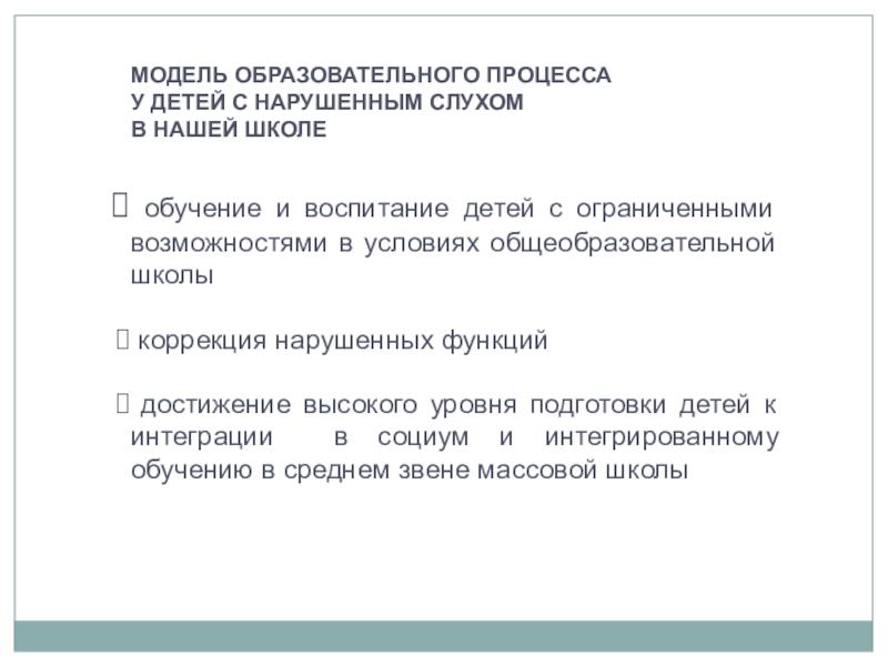 дать информацию о методах и приемах коррекционной поддержки ребенка с нарушенным слухом в процессе школьного интегрированного обучения.