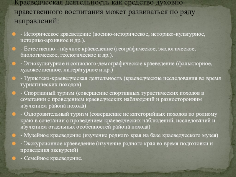 Краеведческая деятельность как средство духовно-нравственного воспитания может развиваться по ряду направлений: