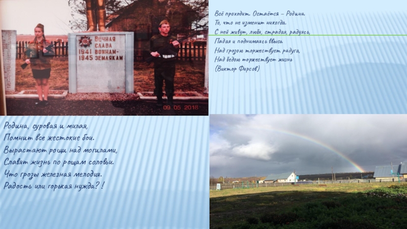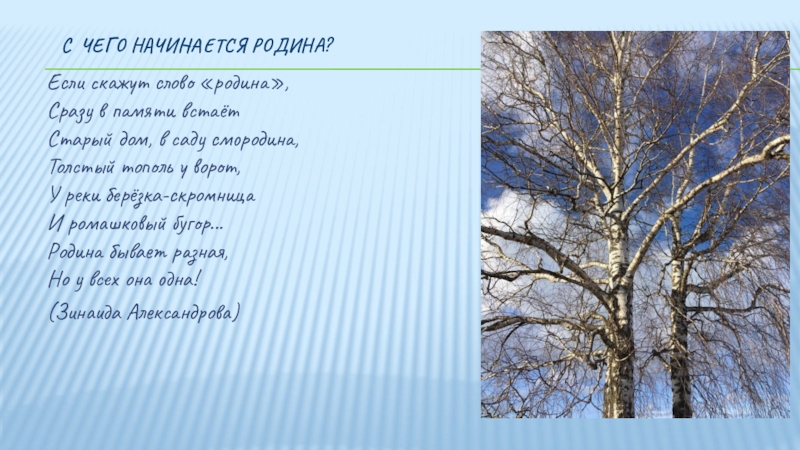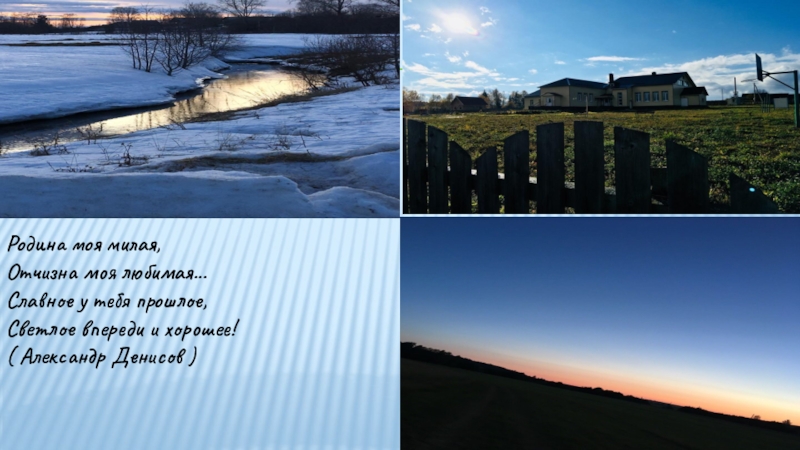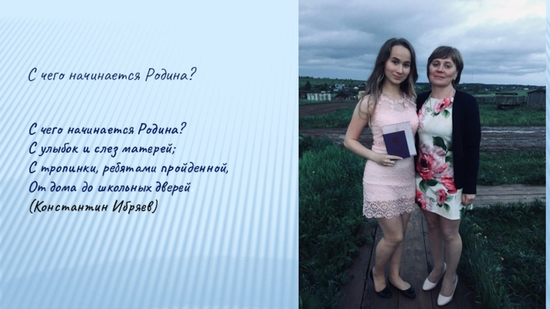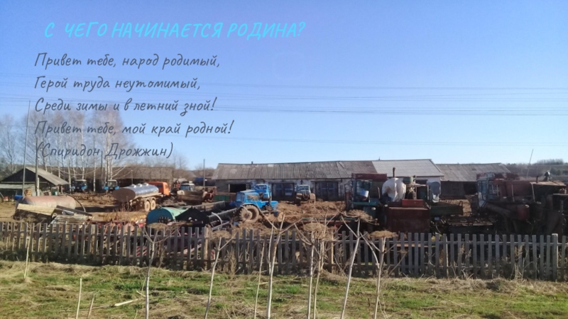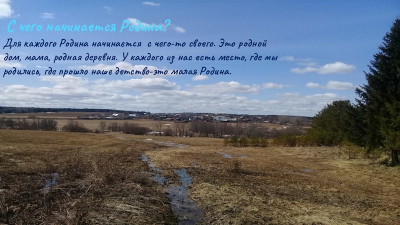 Для каждого Родина начинается с чего-то своего. Это родной дом, мама, родная деревня. У каждого из нас есть место, где мы родились, где прошло наше детство-это малая Родина.