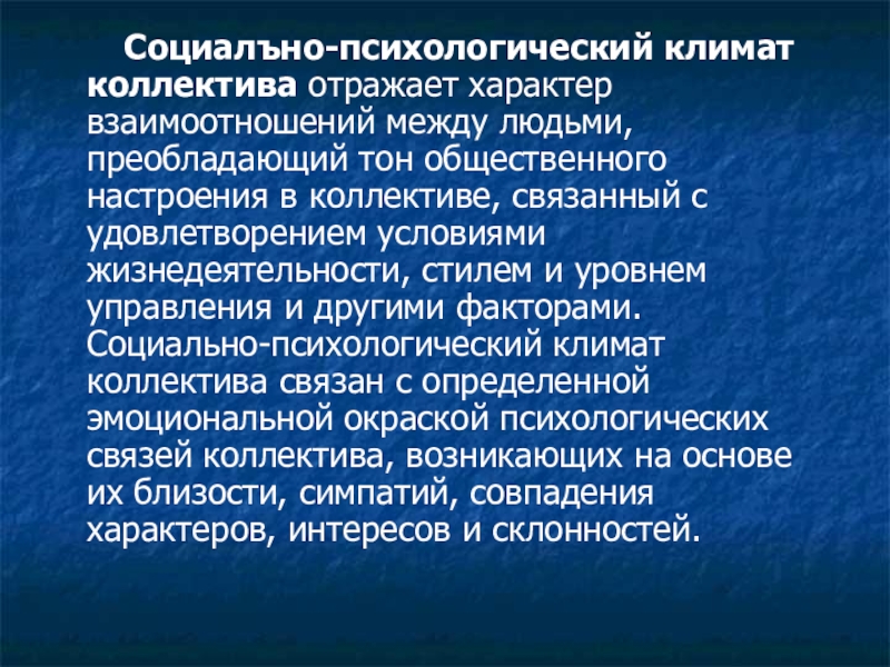 преобладающий тон общественного настроения в коллективе, связанный с удовлетворением условиями жизнедеятельности, стилем и уровнем управления и другими факторами. Социально-психологический климат коллектива связан с определенной эмоциональной окраской психологических связей коллектива, возникающих на основе их близости, симпатий, совпадения характеров, интересов и склонностей.