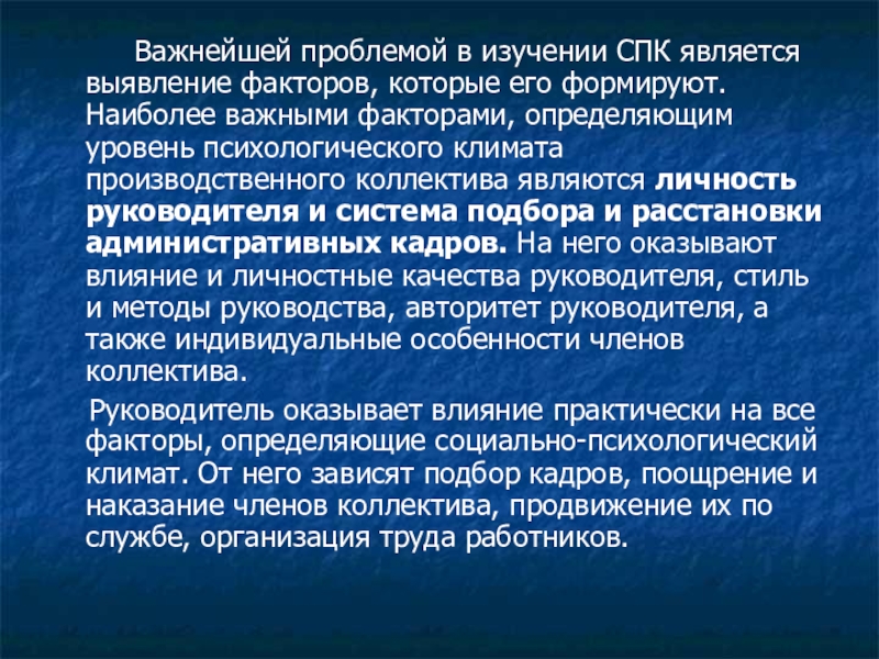 Руководитель оказывает влияние практически на все факторы, определяющие социально-психологический климат. От него зависят подбор кадров, поощрение и наказание членов коллектива, продвижение их по службе, организация труда работников.