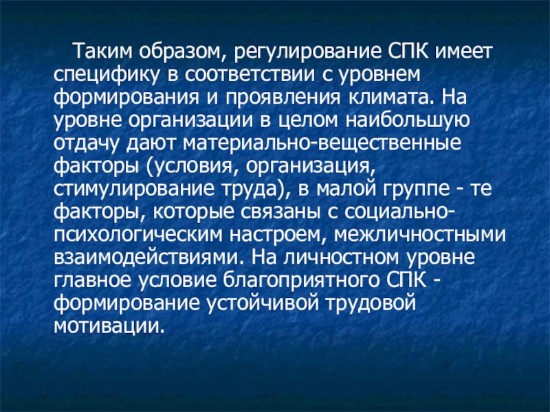 с уровнем формирования и проявления климата. На уровне организации в целом наибольшую отдачу дают материально-вещественные факторы (условия, организация, стимулирование труда), в малой группе - те факторы, которые связаны с социально-психологическим настроем, межличностными взаимодействиями. На личностном уровне главное условие благоприятного СПК - формирование устойчивой трудовой мотивации.