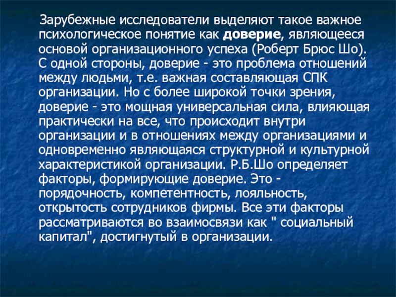 являющееся основой организационного успеха (Роберт Брюс Шо). С одной стороны, доверие - это проблема отношений между людьми, т.е. важная составляющая СПК организации. Но с более широкой точки зрения, доверие - это мощная универсальная сила, влияющая практически на все, что происходит внутри организации и в отношениях между организациями и одновременно являющаяся структурной и культурной характеристикой организации. Р.Б.Шо определяет факторы, формирующие доверие. Это - порядочность, компетентность, лояльность, открытость сотрудников фирмы. Все эти факторы рассматриваются во взаимосвязи как " социальный капитал", достигнутый в организации.