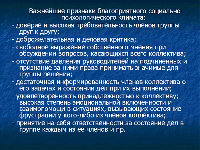 Важнейшие признаки благоприятного социально-психологического климата: