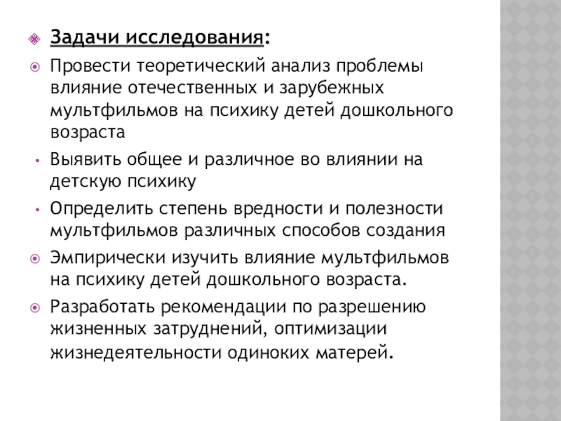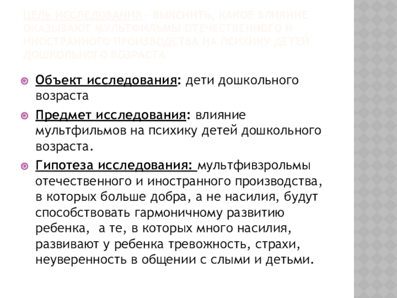 Предмет исследования: влияние мультфильмов на психику детей дошкольного возраста.