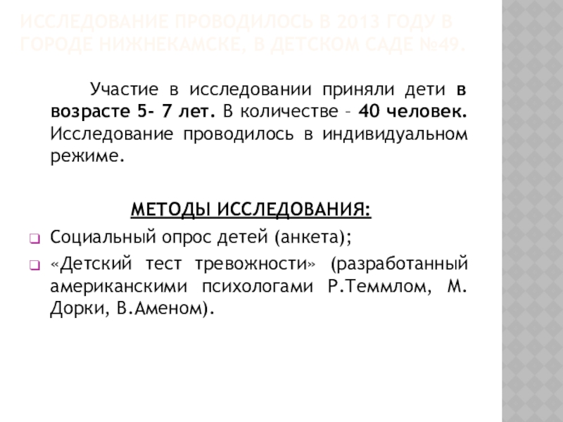 «Детский тест тревожности» (разработанный американскими психологами Р.Теммлом, М.Дорки, В.Аменом).