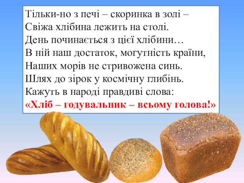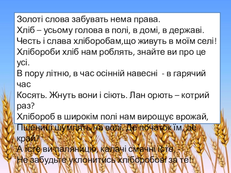 Хлібороби хліб нам роблять, знайте ви про це усі.