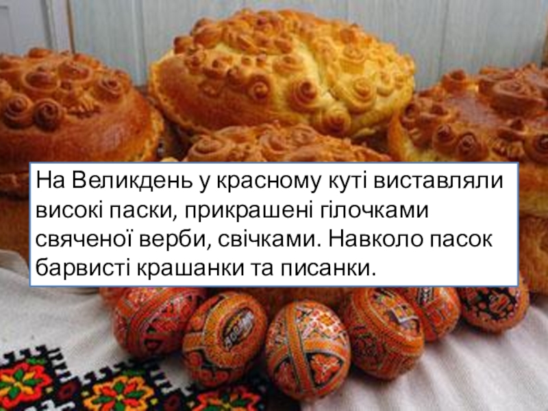 На Великдень у красному куті виставляли високі паски, прикрашені гілочками свяченої