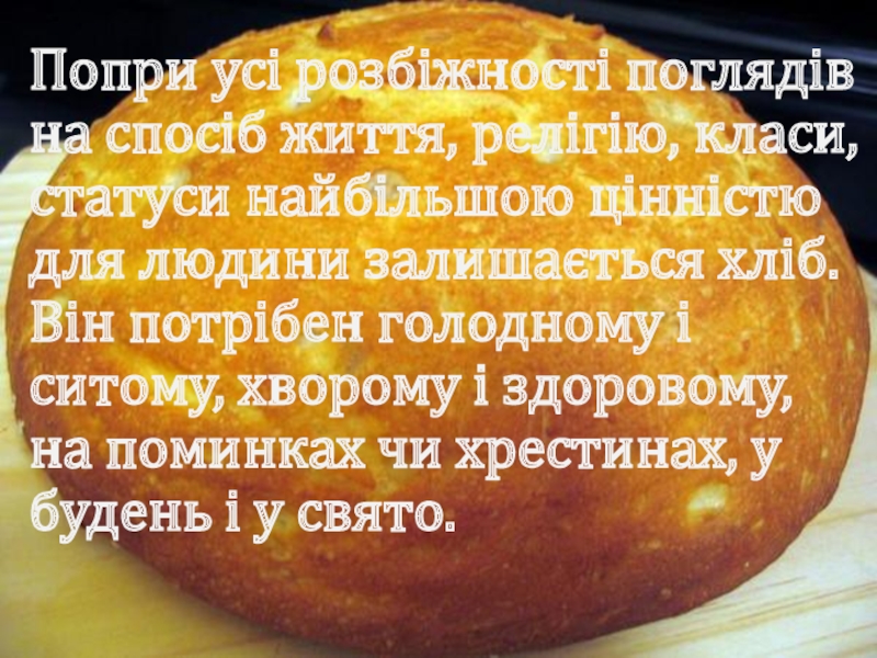 цінністю для людини залишається хліб. Він потрібен голодному і ситому, хворому і здоровому, на поминках чи хрестинах, у будень і у свято.