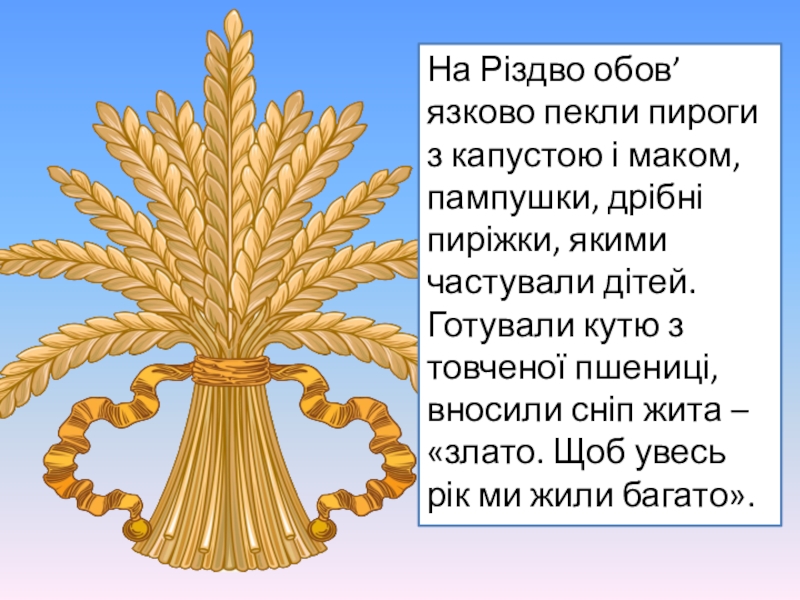 пиріжки, якими частували дітей. Готували кутю з товченої пшениці, вносили сніп жита – «злато. Щоб увесь рік ми жили багато».
