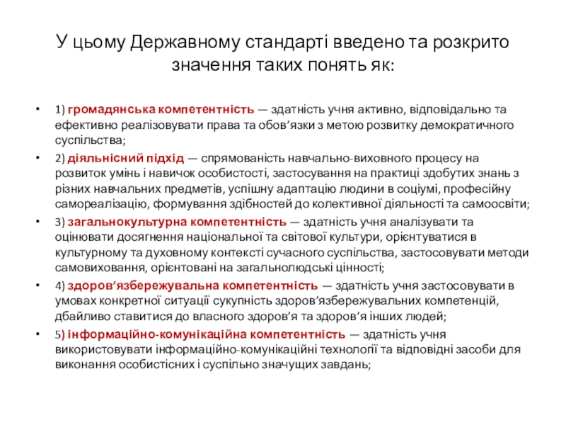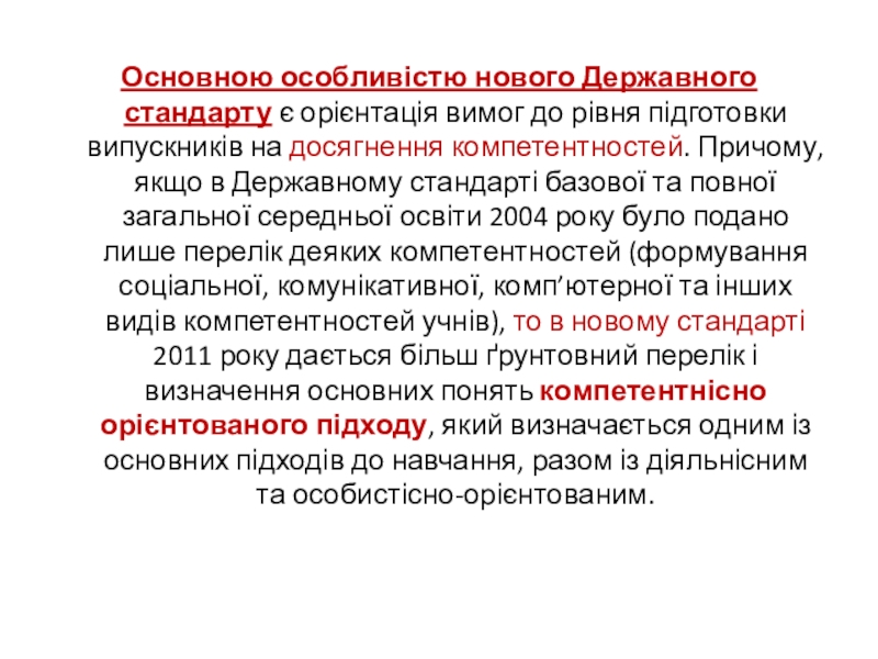 на досягнення компетентностей. Причому, якщо в Державному стандарті базової та повної загальної середньої освіти 2004 року було подано лише перелік деяких компетентностей (формування соціальної, комунікативної, комп’ютерної та інших видів компетентностей учнів), то в новому стандарті 2011 року дається більш ґрунтовний перелік і визначення основних понять компетентнісно орієнтованого підходу, який визначається одним із основних підходів до навчання, разом із діяльнісним та особистісно-орієнтованим.