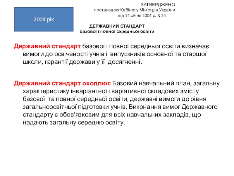 Слайд 9Державний стандарт базової й старшої шкільної освіти, затверджено у листопаді 2011