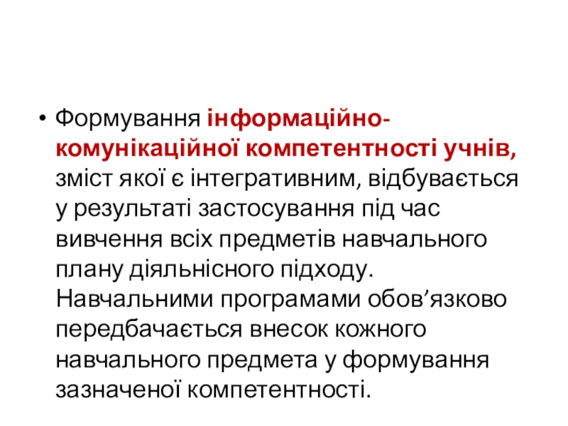 застосування під час вивчення всіх предметів навчального плану діяльнісного підходу. Навчальними програмами обов’язково передбачається внесок кожного навчального предмета у формування зазначеної компетентності.