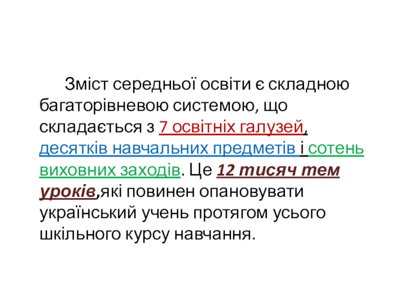 системою, що складається з 7 освітніх галузей, десятків навчальних предметів і сотень виховних заходів. Це 12 тисяч тем уроків,які повинен опановувати український учень протягом усього шкільного курсу навчання.