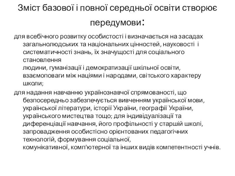 Слайд 3Зміст базової і повної середньої освіти створює передумови: