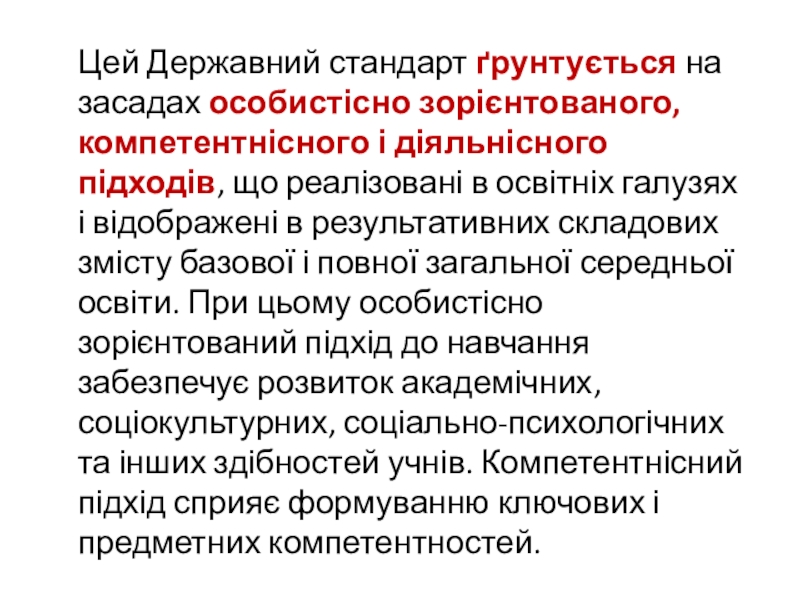 Слайд 22 Цей Державний стандарт ґрунтується на засадах особистісно зорієнтованого, компетентнісного