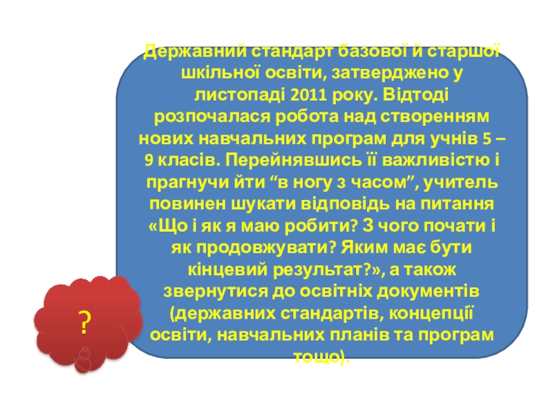 року. Відтоді розпочалася робота над створенням нових навчальних програм для учнів 5 – 9 класів. Перейнявшись її важливістю і прагнучи йти “в ногу з часом”, учитель повинен шукати відповідь на питання «Що і як я маю робити? З чого почати і як продовжувати? Яким має бути кінцевий результат?», а також звернутися до освітніх документів (державних стандартів, концепції освіти, навчальних планів та програм тощо).