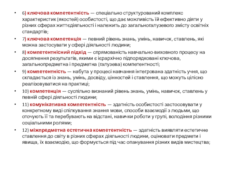 7) ключова компетенція — певний рівень знань, умінь, навичок, ставлень, які можна застосувати у сфері діяльності людини;