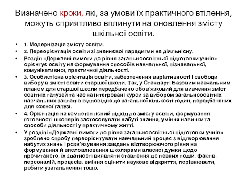 задекларовано перехід до компетентісного підходу до формування змісту освіти та особистісно зорієнтованого навчального процесу;