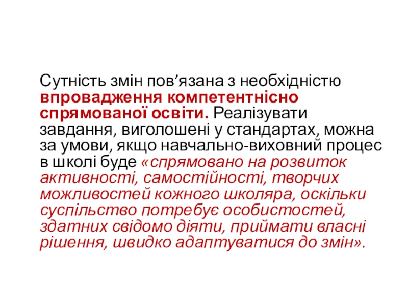 Сутність змін пов’язана з необхідністю впровадження компетентнісно спрямованої освіти.