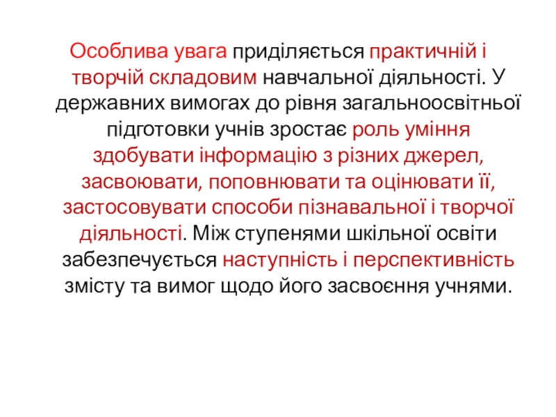 Слайд 4Особлива увага приділяється практичній і творчій складовим навчальної діяльності. У державних