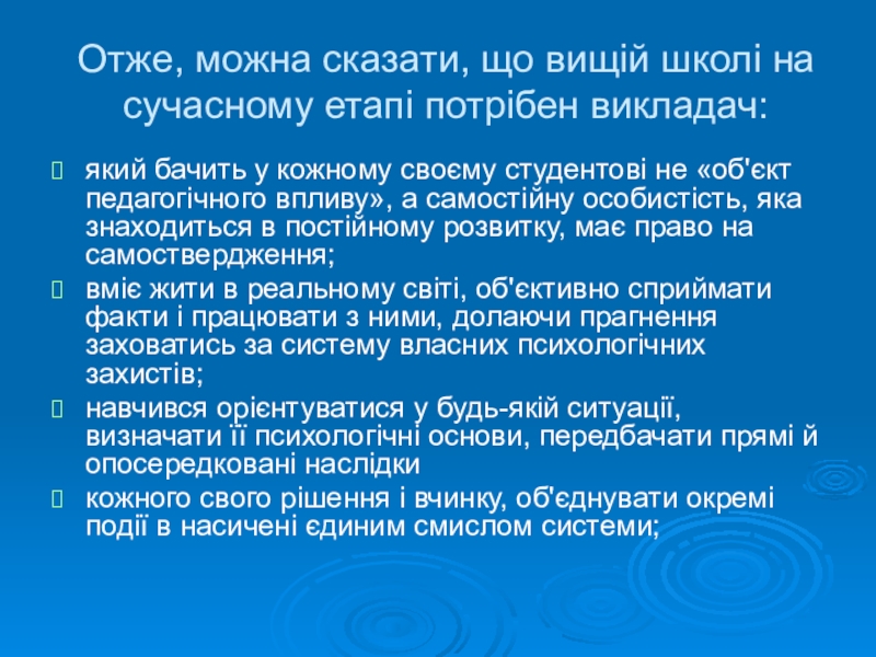 бачить у кожному своєму студентові не «об'єкт педагогічного впливу», а самостійну особистість, яка знаходиться в постійному розвитку, має право на самоствердження;