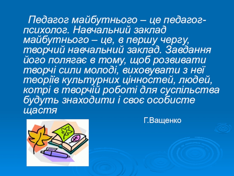 Слайд 2 Педагог майбутнього – це педагог-психолог. Навчальний заклад майбутнього –