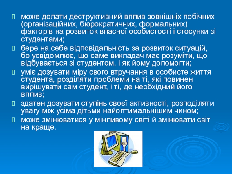 бере на себе відповідальність за розвиток ситуацій, бо усвідомлює, що саме викладач має розуміти, що відбувається зі студентом, і як йому допомогти;