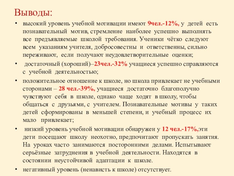 низкий уровень учебной мотивации обнаружен у 12 чел.-17%,эти дети посещают школу неохотно, предпочитают пропускать занятия. На уроках часто занимаются посторонними делами. Испытывают серьёзные затруднения в учебной деятельности. Находятся в состоянии неустойчивой адаптации к школе.