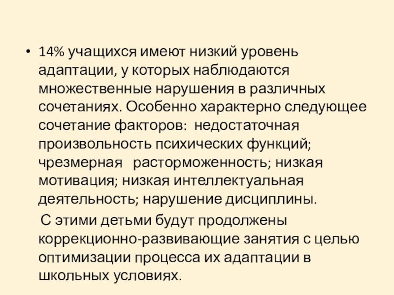 14% учащихся имеют низкий уровень адаптации, у которых наблюдаются множественные нарушения
