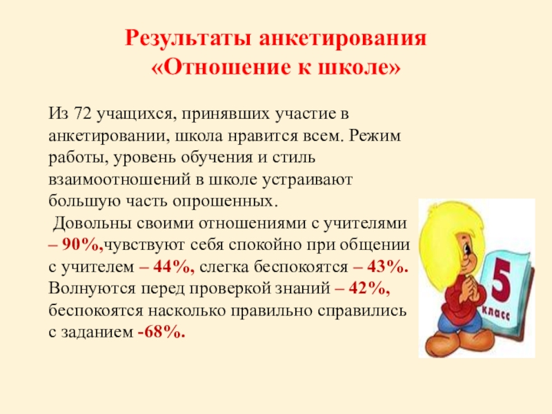 Довольны своими отношениями с учителями – 90%,чувствуют себя спокойно при общении с учителем – 44%, слегка беспокоятся – 43%. Волнуются перед проверкой знаний – 42%, беспокоятся насколько правильно справились с заданием -68%.