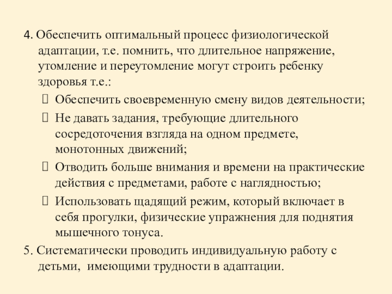 4. Обеспечить оптимальный процесс физиологической адаптации, т.е. помнить, что длительное напряжение,
