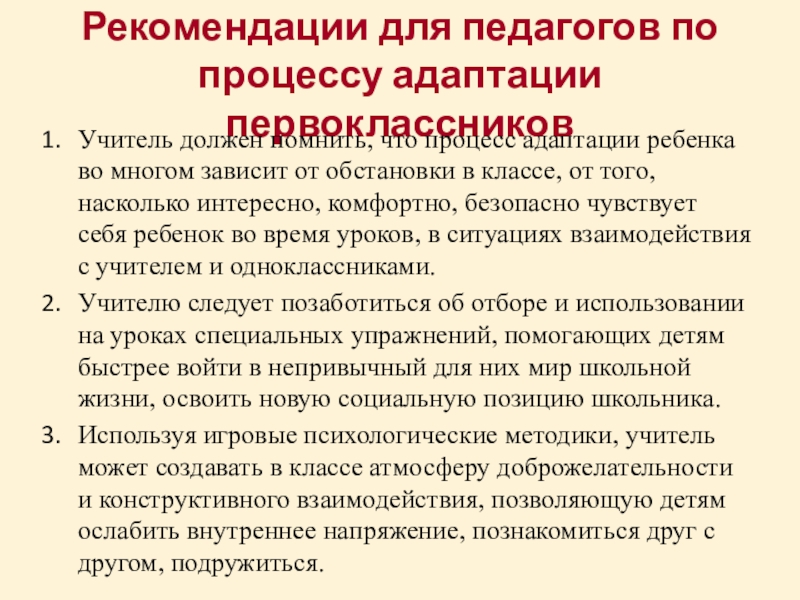Слайд 14Рекомендации для педагогов по процессу адаптации первоклассников