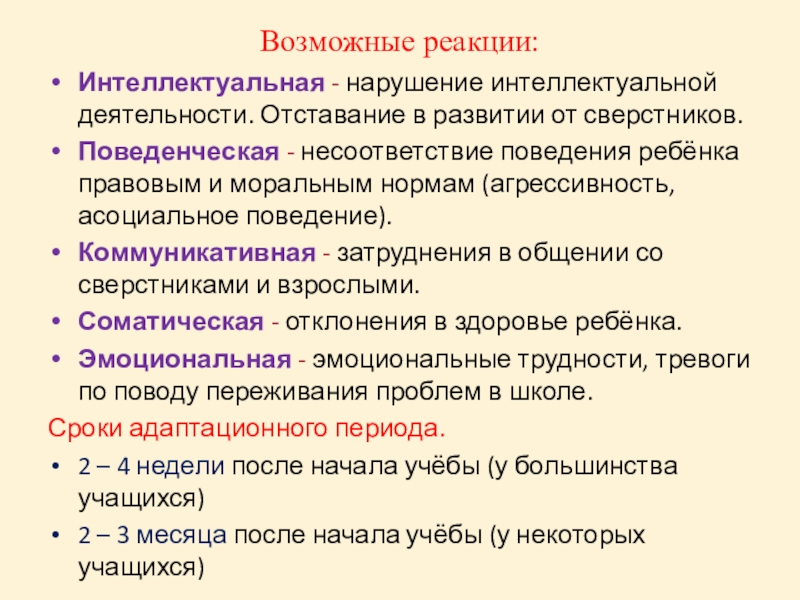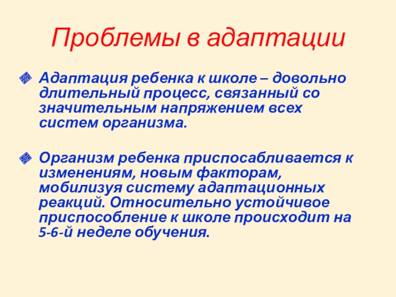 Организм ребенка приспосабливается к изменениям, новым факторам, мобилизуя систему адаптационных реакций. Относительно устойчивое приспособление к школе происходит на 5-6-й неделе обучения.