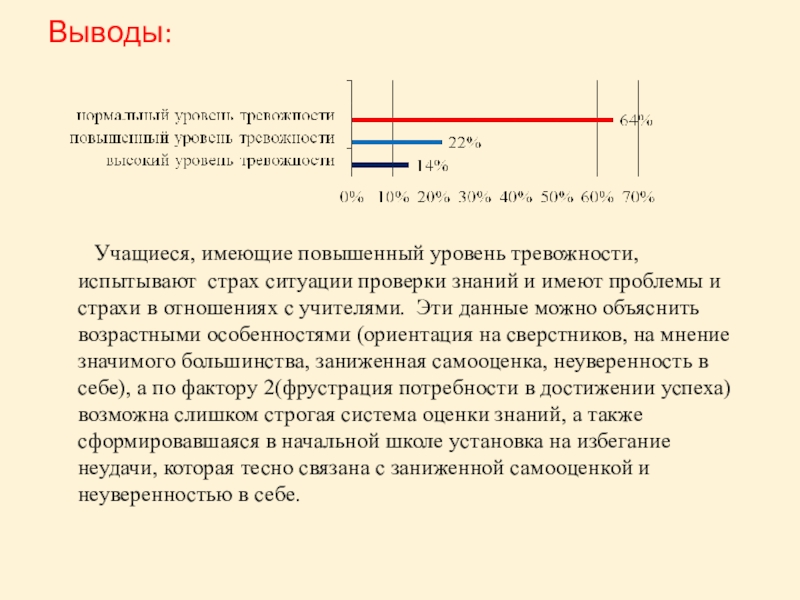 тревожности, испытывают страх ситуации проверки знаний и имеют проблемы и страхи в отношениях с учителями. Эти данные можно объяснить возрастными особенностями (ориентация на сверстников, на мнение значимого большинства, заниженная самооценка, неуверенность в себе), а по фактору 2(фрустрация потребности в достижении успеха) возможна слишком строгая система оценки знаний, а также сформировавшаяся в начальной школе установка на избегание неудачи, которая тесно связана с заниженной самооценкой и неуверенностью в себе.