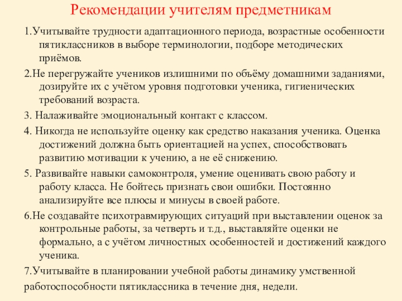 6.Не создавайте психотравмирующих ситуаций при выставлении оценок за контрольные работы, за четверть и т.д., выставляйте оценки не формально, а с учётом личностных особенностей и достижений каждого ученика.