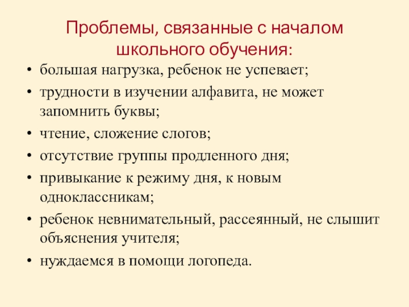 Слайд 9Проблемы, связанные с началом школьного обучения: