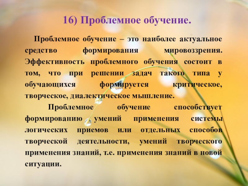 Проблемное обучение способствует формированию умений применения системы логических приемов или отдельных способов творческой деятельности, умений творческого применения знаний, т.е. применения знаний в новой ситуации.
