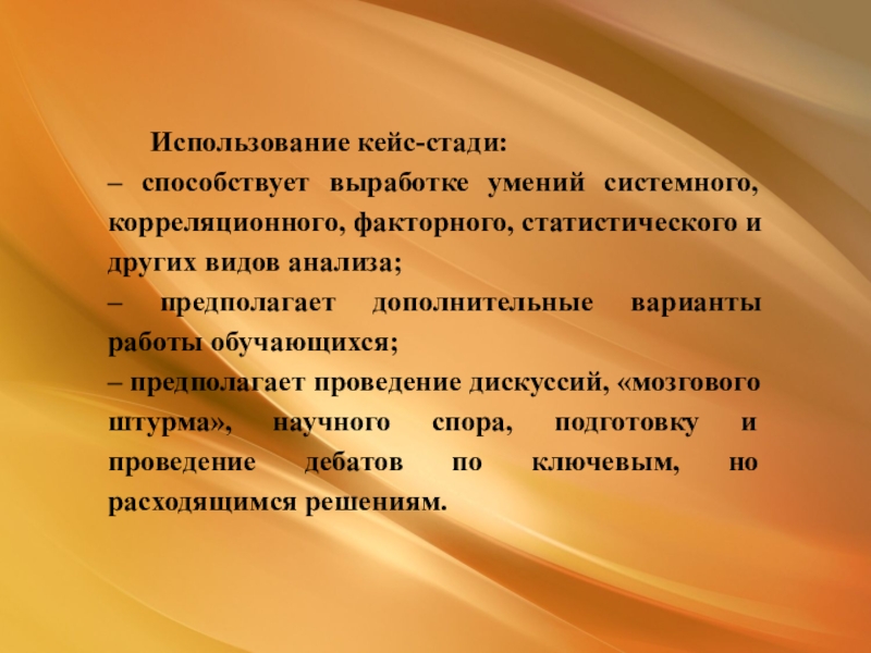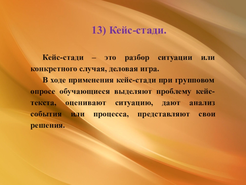 ходе применения кейс-стади при групповом опросе обучающиеся выделяют проблему кейс-текста, оценивают ситуацию, дают анализ события или процесса, представляют свои решения.