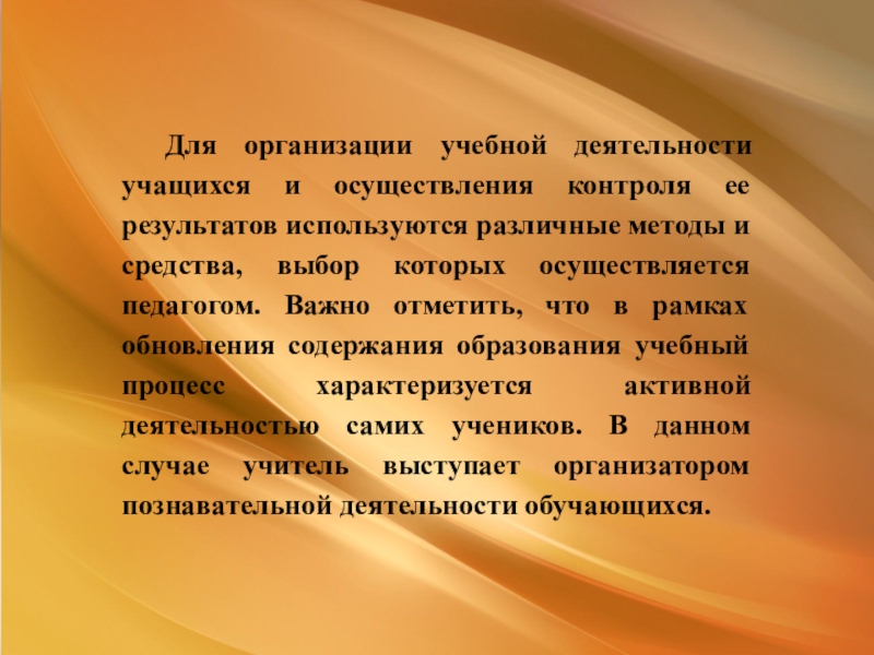различные методы и средства, выбор которых осуществляется педагогом. Важно отметить, что в рамках обновления содержания образования учебный процесс характеризуется активной деятельностью самих учеников. В данном случае учитель выступает организатором познавательной деятельности обучающихся.