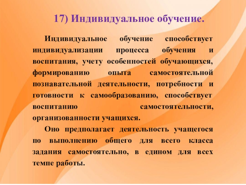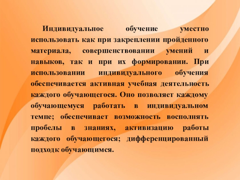 Слайд 49Индивидуальное обучение уместно использовать как при закреплении пройденного материала, совершенствовании умений