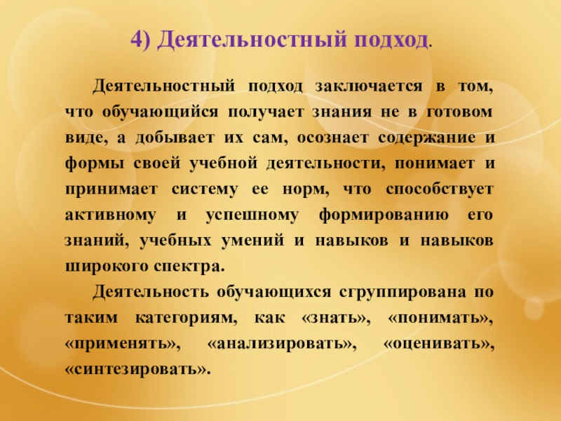 Деятельностный подход заключается в том, что обучающийся получает знания