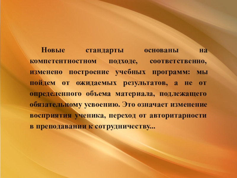 мы пойдем от ожидаемых результатов, а не от определенного объема материала, подлежащего обязательному усвоению. Это означает изменение восприятия ученика, переход от авторитарности в преподавании к сотрудничеству...
