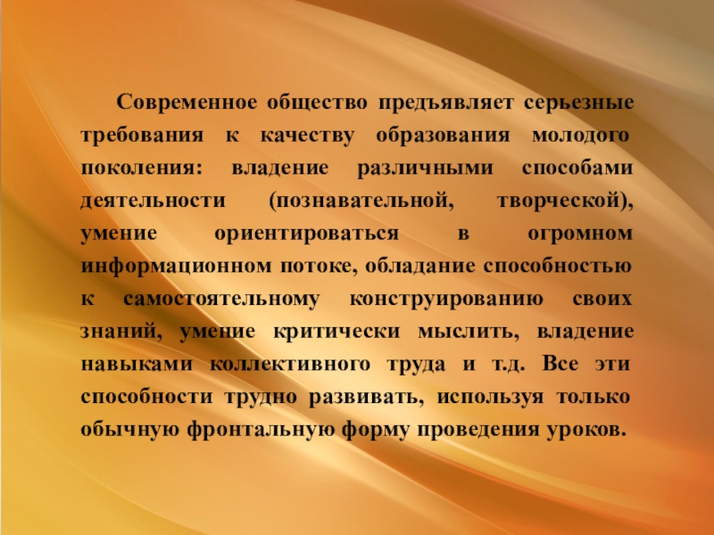 Современное общество предъявляет серьезные требования к качеству образования молодого поколения: владение различными способами деятельности (познавательной, творческой), умение ориентироваться в огромном информационном потоке, обладание способностью к самостоятельному конструированию своих знаний, умение критически мыслить, владение навыками коллективного труда и т.д. Все эти способности трудно развивать, используя только обычную фронтальную форму проведения уроков.
